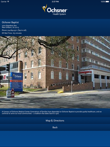 Recognizing that emergencies happen anywhere, anytime, Ochsner Health System has developed the Ochsner ER Wait Times app. It provides estimated wait times for each of its 5 ER locations so patients can determine which ER can help them as quickly as possible. A maps function provides directions and an estimated travel time from where you are to the Ochsner ER with the shortest wait time.