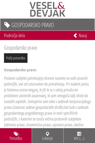 V odvetniški družbi Vesel - Devjak imamo pri svetovanju našim strankam povsem preprosto vodilo: vsake zadeve se lotimo, kot da bi bila naša lastna. Tako lahko dosežemo zastavljene cilje: strokovno in kvalitetno opravljeno delo, odzivnost in hitrost ter zadovoljna stranka.