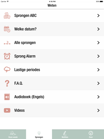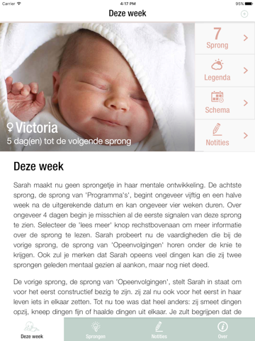 De app is ook een handige reminder voor ouders als hun babys hersenen aan het veranderen zijn, als ze een sprong maken, of de baby een belangrijke stap zet in zijn mentale ontwikkeling. Met elke stap verandert de manier waarop je kind de wereld om zich heen ervaart drastisch. Omdat de sprongen elkaar zo snel opvolgen, kunnen deze ‘nieuwe wereld’ en nieuwe vaardigheden soms eng zijn. Deze ontwikkelingen kunnen in eerste instantie laten zien door slecht slapen, minder eetlust, huilen, hangerigheid en humeurigheid –vermoeide en gefrustreerde ouders.