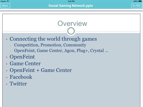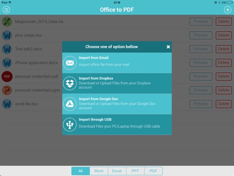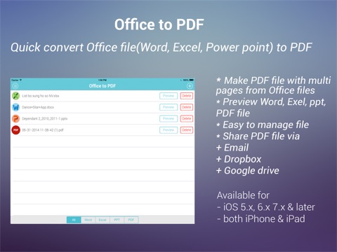 Открывает только документы word (doc, docs), excel (xls, xlsx) и power point (ppt, pptx), все эти файлы может конвертировать в PDF и на этом все. Фото (jpeg, gif, tiff), файлы с расширением RTF или TXT, архивы win-rar, zip не видит. Из сторонних приложений и из почты не смог открыть в данном приложении файлы word, excel и pdf. В приложении присутствует рекламный баннер (внизу). Из положительных сторон отмечу: + Работает с облачными сервисами, проверил работу с Dropbox. + Все еще можно открыть по iOS 5.0. + Малый вес приложения. За деньги не рекомендую, приложение удаляю. Если вам нужен бесплатный конвертор файлов в PDF, поставьте приложение "Documents 5" от Readdle, ну а если готовы потратить на это деньги, то установите дополнительно приложение "PDF PROvider" или приложение "Docs & Works" от разработчика Darsoft Inc., хотя приложения "Documents 5" возможно будет уже более чем достаточно.