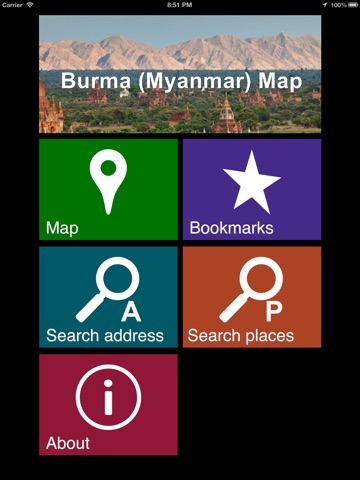 Burma (Myanmar) offline map mobile application. All data is stored in the phone memory for offline usage.
