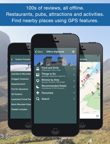 The app is focused on providing comprehensive content and helping you find great places nearby. It features an offline map but you may also wish to use Offline Highlands in partnership with a navigation device, such as an in-car GPS system.