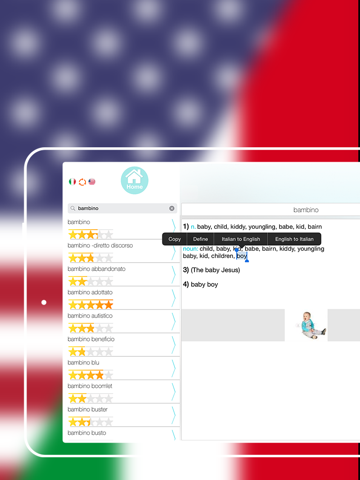 Our Italian to English Dictionary will help you to amend your Italian and English language skills by its comprehensive words, word definitions, synonyms etc. The application which is authorized for Apple device can be used without the internet demand.