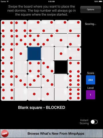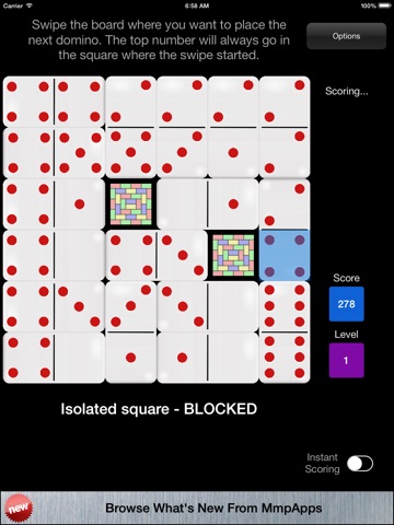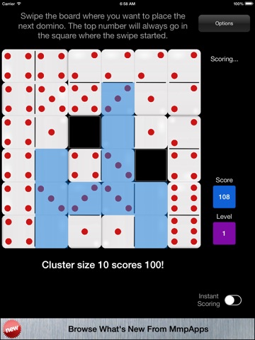 After no more dominoes can be placed the level is complete. Any squares that do not belong to a cluster are blocked and are out-of-play for the rest of the game. The game ends when all 36 squares are out-of-play.