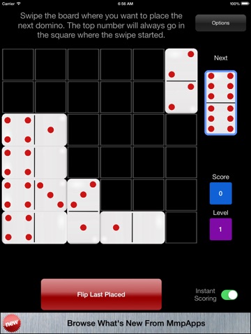 Oh Dominoes!! is a single player game where you place a series of randomly chosen dominoes in an 6x6 grid. The objective is to make like-numbered clusters of adjacent square. There are no other restrictions. The larger the cluster the more points you score. Sounds simple... but you will be challenged.