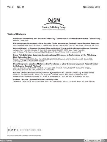 The Orthopaedic Journal of Sports Medicine ( OJSM ), developed by the American Orthopaedic Society of Sports Medicine (AOSSM), is a global, peer-reviewed, open access journal that combines the interests of researchers and clinical practitioners across orthopaedic sports medicine, arthroscopy, and knee arthroplasty. Topics include original research in the areas of orthopaedic sports medicine, arthroscopic Surgery, relevant translational research, sports traumatology/epidemiology, and knee arthroplasty.