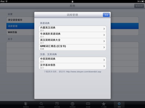 6.您可以从我们官方网站免费下载各个专业词库(包括英汉,英德,法等各类词库), 然后通过wifi同步:将下载的okpkg词库文件解压后直接通过wifi上传到程序的根目录, 然后重启词典或进入词库管理即可加载新的词库。词库管理可以删除词库, 隐藏/显示各类词库。,