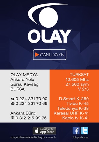 Olay TV (www.olaytv.com.tr), iPhone uygulaması ile Bursada, yurtta, dünyada yaşayan tüm gelişmelere, tüm haberlere iPhoneunuz ile anında ulaşabileceksiniz.