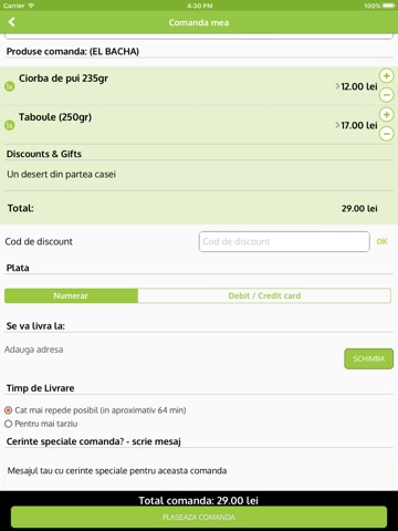 • Adrese: Poți folosi oricând una dintre adresele de livrare salvate în aplicație pentru o comandă viitoare.