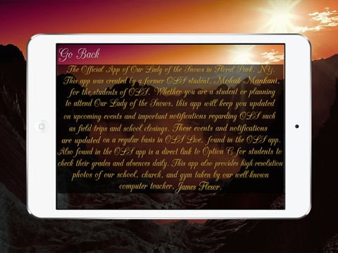The Official App of Our Lady of the Snows in Floral Park, NY. This app was created by a former OLS student, Mohak Mankani, for the students of OLS. Whether you are a student or planning to attend Our Lady of the Snows, this app will keep you updated on upcoming events and important notifications regarding OLS such as field trips and school closings. These events and notifications are updated on a regular basis in OLS Live, found in the OLS app. Also found in the OLS app is a direct link to Option C for students to check their grades and absences daily. This app also provides high-resolution photos of our school, church, and gym taken by our well-known computer teacher, James Flesor.