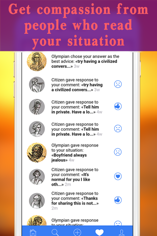 Olymp is a social app that helps to find solutions in difficult psychological situations. Look at the world of the gods and divine transformations to increase situation awareness. Get natural emotions and have an advice from other app users in a common or a private chat way. All situations, comments and messages are FREE and ANONYMOUS.