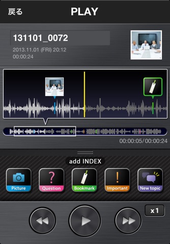 You can attach images taken by smartphones to voice files recorded by the recorder. You can attach images exactly as you do when adding normal index marks. Also you can select 4 other types of index marks which allow you to find the position easily.