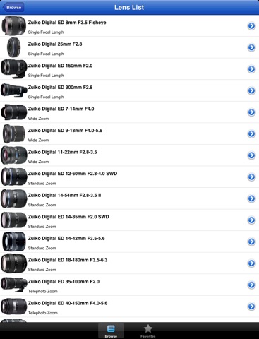 The Olympus Lens Buddy app allows you to browse the full range of Olympus Micro Four Thirds and Four Thirds lenses. It allows you to browse all the lens manufacturers based on the lens mount.