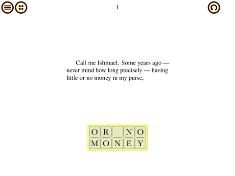 Playing OMBY, you’ll unscramble sets of 1x2 domino word tiles containing portions of text that have been blacked-out, as if by a censors pen. As you solve each puzzle, the blacked-out text is revealed. Pause periodically to savor the completed paragraphs.
