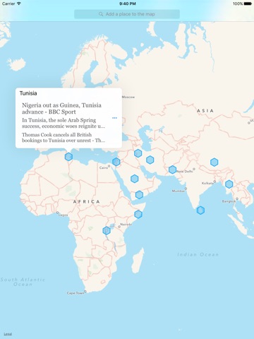 Your own personal situation room. Omniscient lets you drop a pin anywhere in the world and get the latest headlines about it. Its a visual, simple way to keep tabs on our world, customized for the stories and places you care about the most.