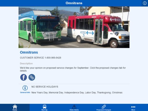 This is the official app of Omnitrans, the public transit agency serving bus riders in the San Bernardino Valley. This easy-to-use app includes features like NexTrip real-time bus arrival prediction, Rider Alerts, Bus Book, News & Rider Stories, Photos and more. We also occasionally offer special free ride coupons and other promotions to our app subscribers.