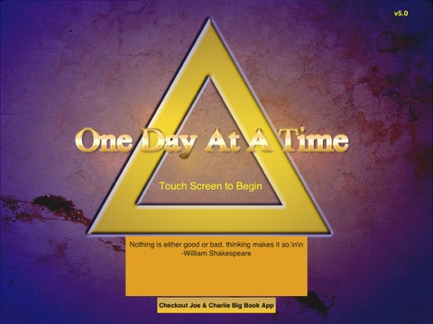 I bought this a few days ago, along with other apps, including aa to go & 12 step companion. All work fine except this odaat app, which will only open to the initial splash screen, but then when you "Touch screen to begin", it just goes away. No error, nothing. Hope they fix it soon.