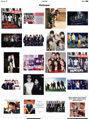 You can find wallpaper of One Direction. You can save photo local to iPhone and later save as a wallpaper. You can share wallpaper to Facebook, Twitter and also send via email.