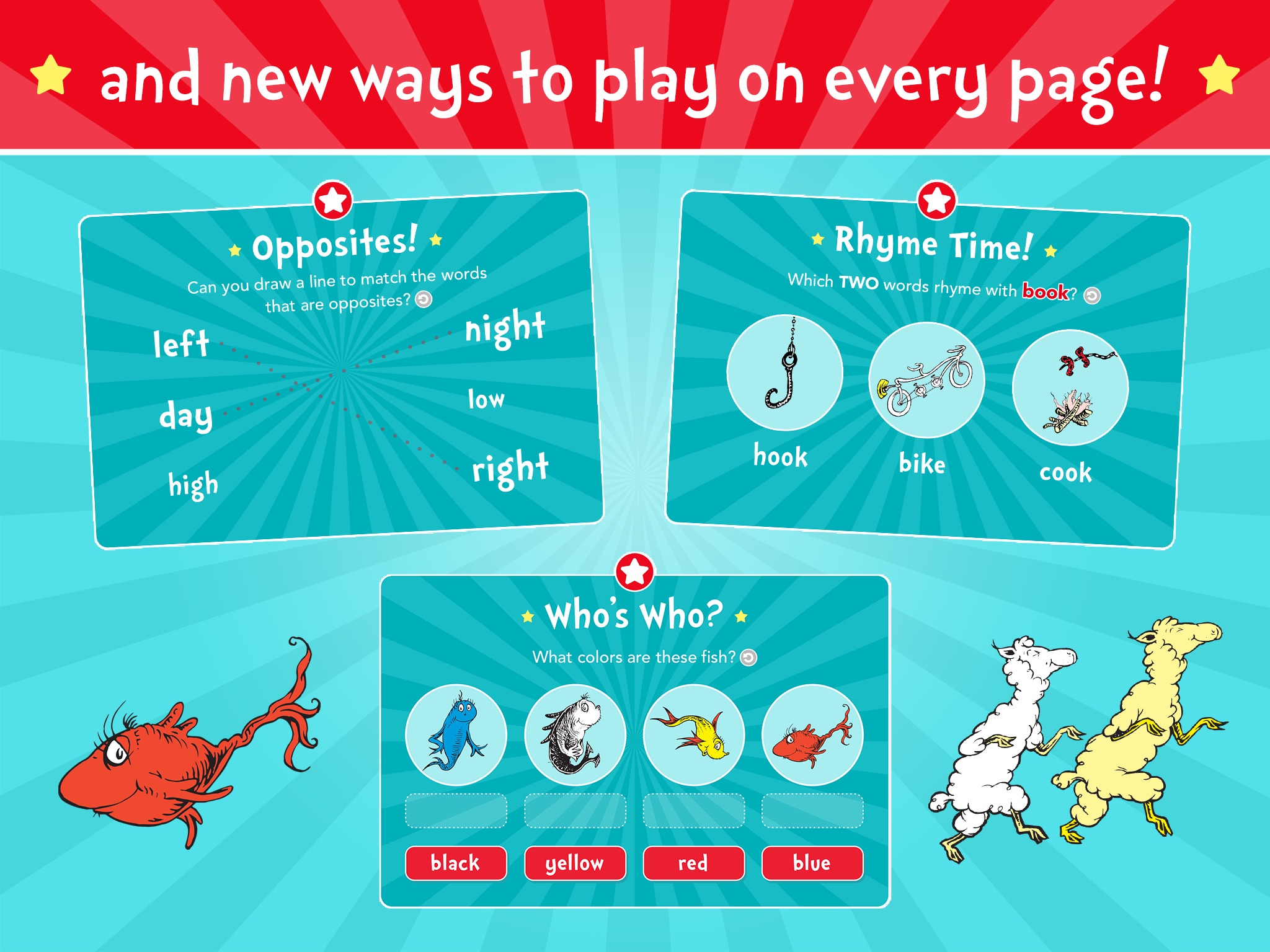 The best-selling Dr. Seuss classic “One Fish Two Fish Red Fish Blue Fish” comes to life with playful interactivity, delightful animations and fun activities!
