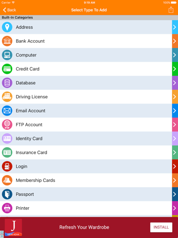 - Contains list or more than 20 categories or entries like (Address, bank account, credit card, email account, passport SIM card, TV channel...etc).