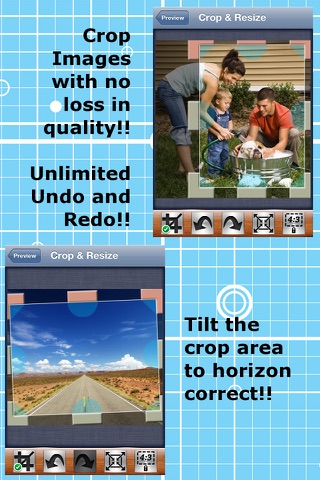 You can crop and rotate your photos and you can even straighten with two finger free rotation of the crop area. Make a mistake? No problem - the app supports undo and redo of any edit to your photo. Want to set the aspect ratio? You can set it from 1:24 to 24:1, and anywhere in between with our innovative aspect ratio selection view.