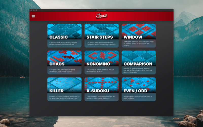 One Sudoku is the ultimate Sudoku app for your Mac. It features 11 varieties of Sudoku puzzle types in different sizes with selectable difficulty levels.