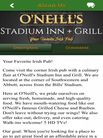 The O’Neill’s Stadium Inn and Grill app provides information on our pub including location, hours, and our menu. Using this app, you can access our rewards benefits as well as receive updates on specials. This app is essential for staying up to date with all things O’Neill’s. Your Favorite Irish Pub!