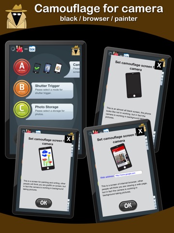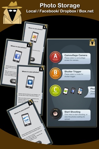 If you want to take a secret photo, you must look like you are not using the camera. So when you open up the app you will see four sliding buttons to aid you on your mission: Camouflage Camera, Shutter Trigger, Photo Storage and Start Shooting. These sliding buttons when pressed reveal an array of settings. In the camouflage settings menu you can choose from 3 very ingenious disguises.