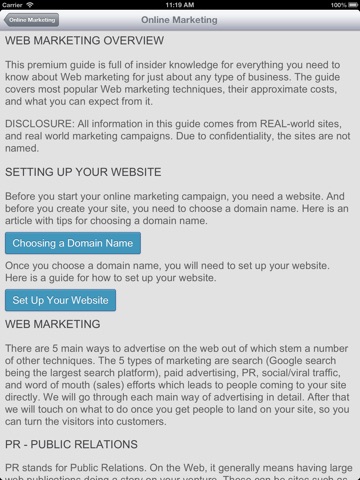 - Help on the app with the ability to ask online marketing questions. Note that we also provide expert help and marketing advice as a premium service.