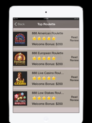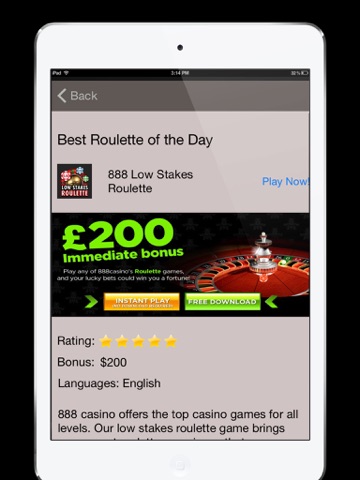 The moment I opened the app there is NO ROULETTE!! A graphical list of the top mobile casinos came on the screen. I clicked on one and was taken out of the app and immediately turned off my device. Here I am to give you a zero star rating and to warn others of this waste of time.