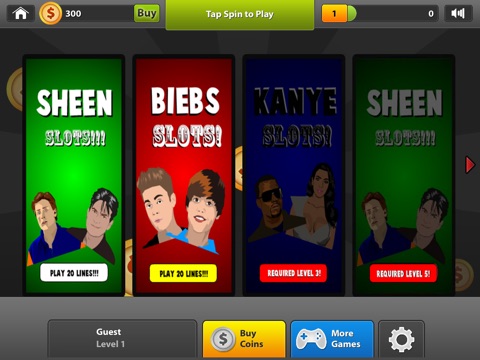 That third machine is known as the "KANYE Slots" game, and it takes Mr. West to town for his numerous social and media mishaps over the past 10 years or so. Because the machine is the first to be unlocked, its also the first that offers higher credit-per-line bets and correspondingly higher payouts when a bonus or wild symbol appears on the screen. Unlocked at player level 3, this machine will help players unlock more advanced Sheen, Biebs, and Kanye options at levels 5, 7, 9, 11, and 13.