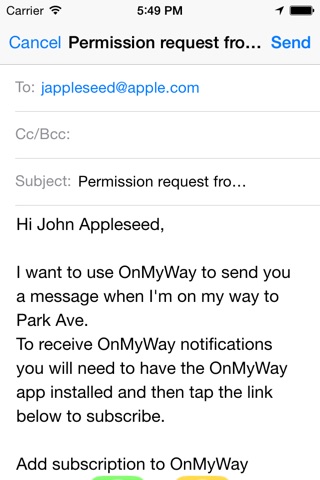 On your way to pickup someone. You want to tell them youre nearly there but you cant take your hands off the wheel? OnMyWay can automatically send a notification to their iPhone. Handsfree operation detects when you are nearly there and sends a message ahead.
