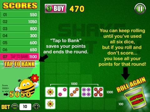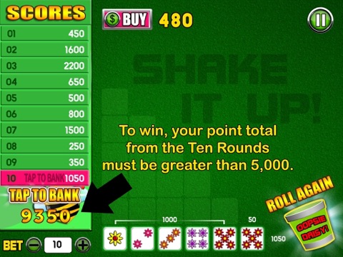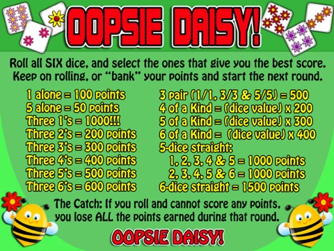 There are ten rounds in the game. You start each round with six dice. Tap the cup and roll them, and select the ones that provide the best score. Then tap the column on the left to "bank" your points and move on to the next round, or tap the cup to roll the remaining dice. But beware: If you roll and dont score any points - Oopsie Daisy! You lose any points you had won during that round.