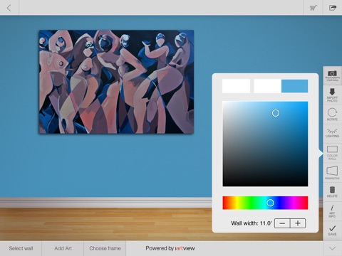 Take a photo of any wall and instantly view artwork to scale from Open Door Gallerys inventory. Easy, one-touch adjustments accommodate for angle, light and wall color. No measuring required.