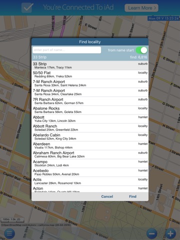 Browse OpenStreetMaps®, download for offline use. Use GPS, save track logs. Searchable locality layer: city, town, village, hamlet.