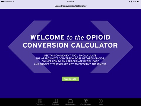 The Dosing Calculator offers physicians a convenient tool to accurately calculate the equianalgesic dose of an opioid from the patients current opioid(s). Since some patients are on a regimen of more than 1 opioid, the dosing calculator allows you to enter up to 2 opioids. The conversion ratios are based on available guidelines and prescribing information. This application has been certified by an independent third party.