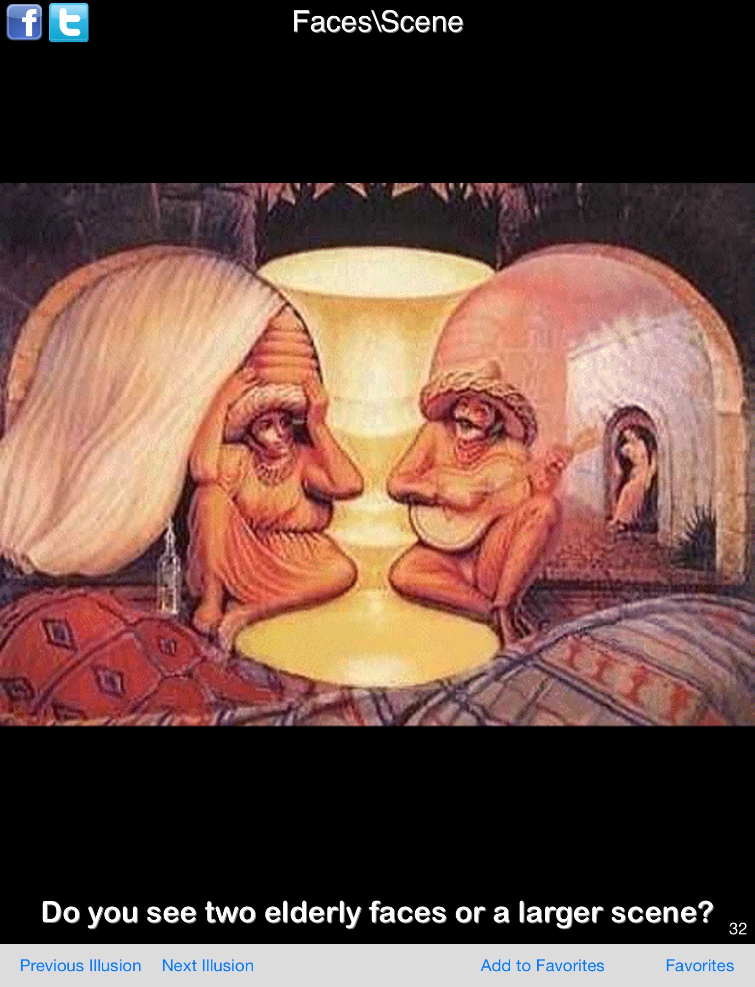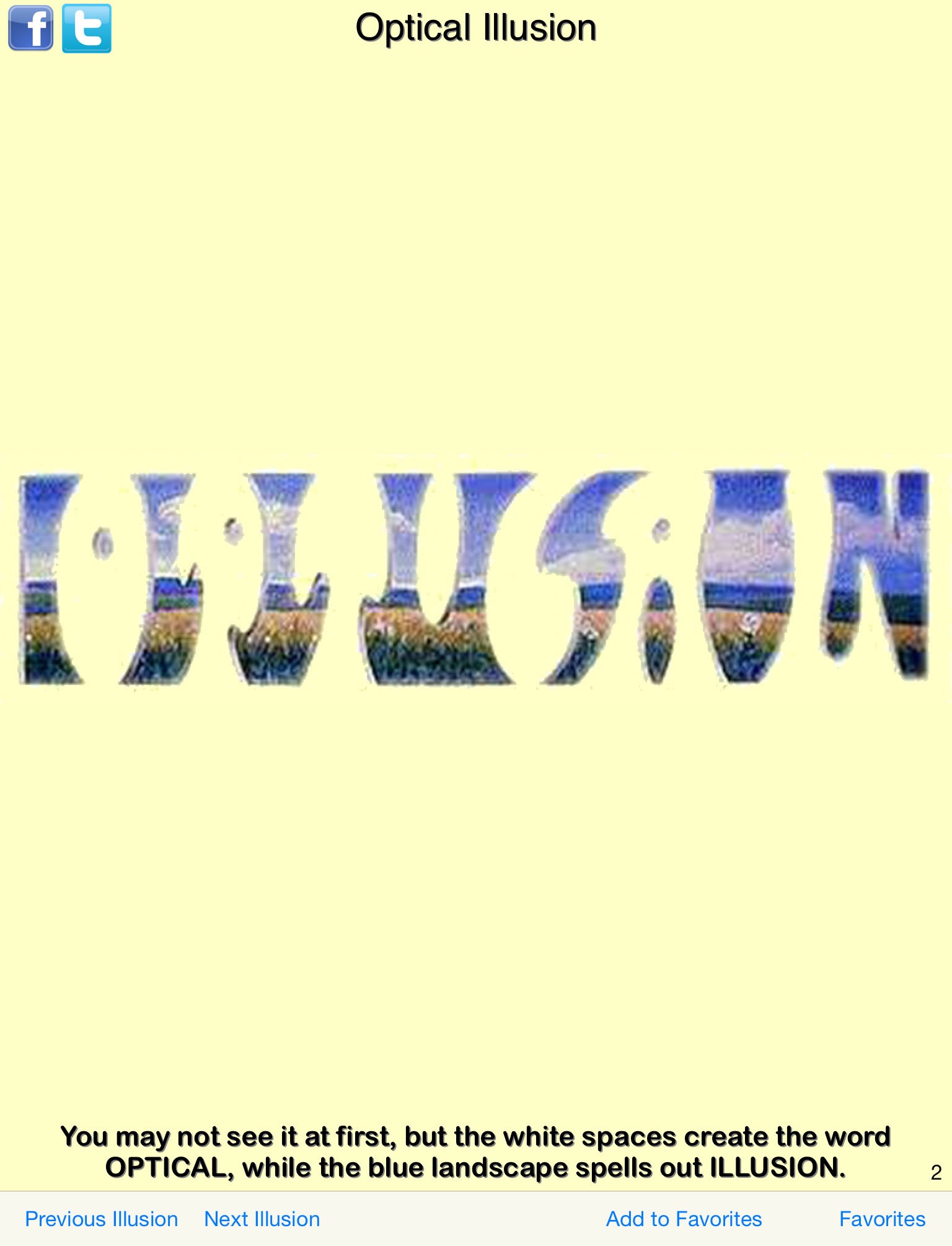 • One can only browse through all pictures from start to end, no categories, no order, not even going backwards • The text below is a static part of the picture that cannot be hidden • You cannot zoom the picture part to fullscreen. No, rotating the phone doesnt help. This makes some illusions nearly impossible to see. • Also, there are no surprises in here for a real fan of optical illusions… So: Get these classics on the Net for free, and watch them fullscreen on your monitor…
