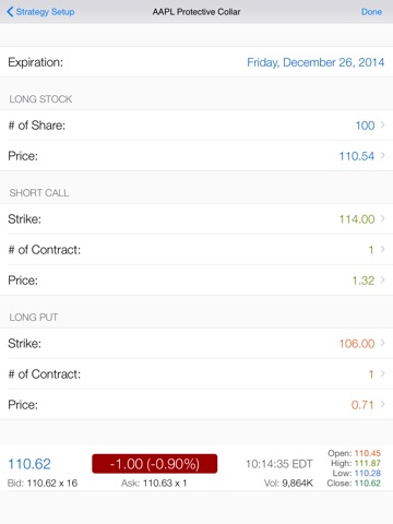 Collar Pro is very powerful in helping you make right decisions in options trading. It helps you watch the market through visualized market information and visualize your risk/reward of the option strategy. Using the Black-Scholes model to price options, Collar Pro draws / visualizes the payoff of options strategies and clearly presents how time decay impacts strategies. Play with the IV Slider and the Date Slider to watch the impact and evaluate your strategy further more. Also enjoy the dynamic, lightening fast, near Real-Time options chains.