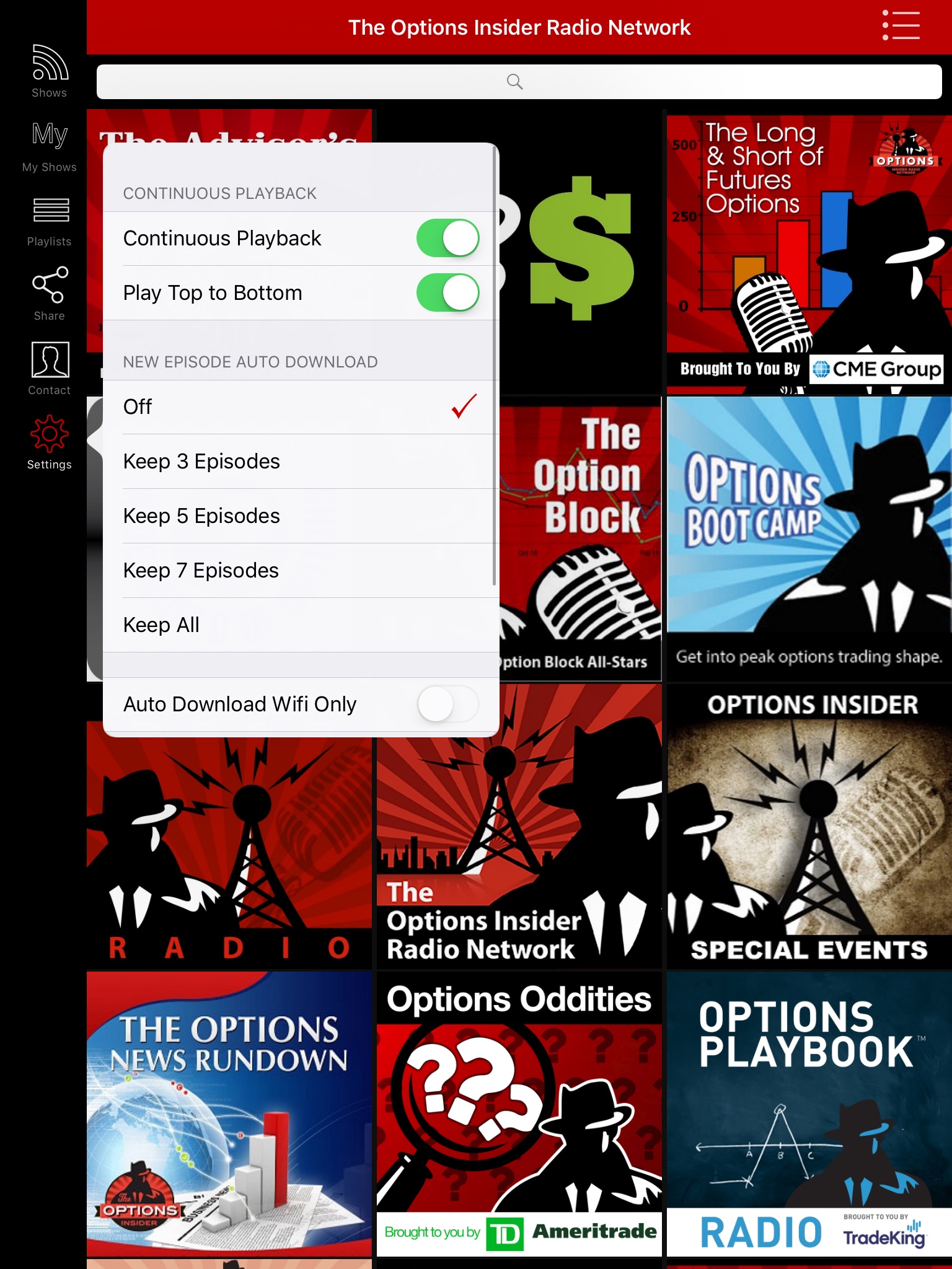 * Access to the full Options Insider Radio Network Catalog - over a thousand options programs at your fingertips