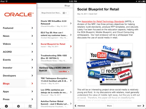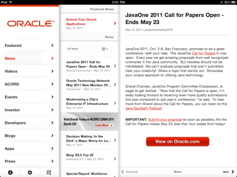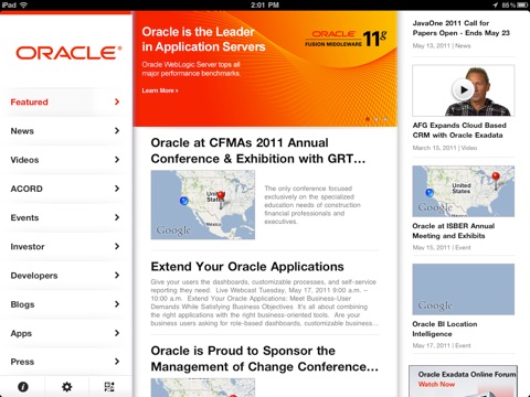 The Oracle application provides a high-level view of everything Oracle, the world’s largest enterprise software company. Get the important news first. Hear about developments, releases, mergers and acquisitions, and other important events.