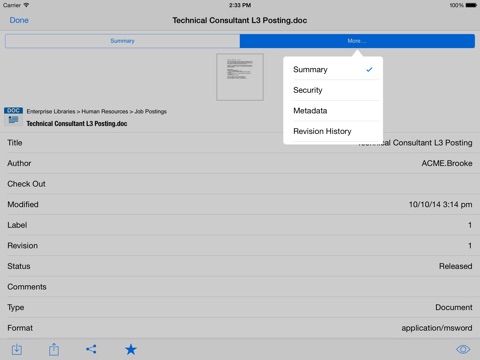 Oracle WebCenter Content for iOS provides simple, secure access to your Oracle WebCenter Content environment, version 11.1.1.8.0 or higher. Users can easily browse, view, favorite and download important business documents from virtually anywhere. With the ability to download, critical files are stored locally in an encrypted format and available with or without an Internet connection. Oracle WebCenter Content for iOS ensures that your mobile workforce can stay informed and up-to-date with the most current information - ensuring better business decisions and faster resolution of issues.