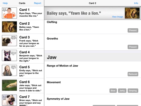 This app will help give clinicians valuable information regarding deficits in a client’s oral structure or function that may result in a speech disorder. A variety of areas will be assessed, including orofacial cleft, missing teeth, decreased tongue mobility, decreased lip mobility, lack of velar closure, and ankyloglossia. This oral peripheral examination will provide insight regarding what type of articulation errors may occur and how treatment should be addressed.