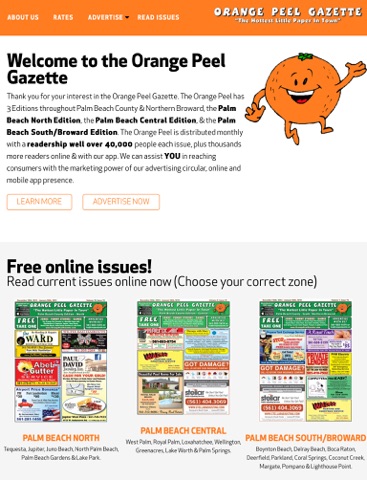 The Orange Peel Gazette is the widest read “free” publication in Florida and has been in circulation for over 12 years. This app features the 3 Editions in Palm Beach County & Northern Broward which are, the Palm Beach North Edition, the Palm Beach Central Edition, & the Palm Beach South/Broward Edition. The Orange Peel Gazette is distributed monthly with a readership well over 120,000 people in print, plus thousands more online/app readers. The Orange Peel contains jokes, humorous stories, trivia, word games, interesting facts and refreshing articles for you to enjoy. Our new app allows you to read all of the latest & previous issues in an easy to use format with crystal clear resolution. The app also features company info, advertising rates, contact info and the ability to place an ad directly from your mobile device. Enjoy!
