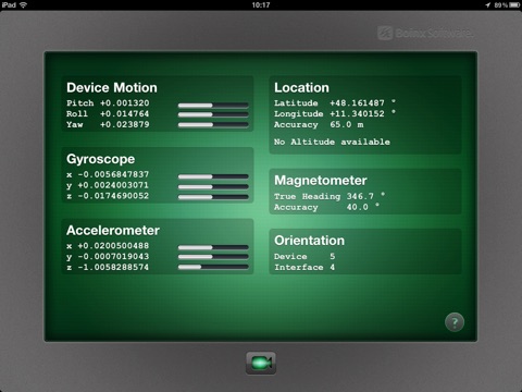 Orientator reads out the values for device orientation (Pitch, Roll, Yaw), the gyroscope (x,y,z), the accelerometer (x,y,z), location (latitude, longitude, altitude, accuracy), magnetometer (heading, accuracy) and the values for orientation (device, interface). It displays them on the display of your device and when connected transmits them over WiFi to BoinxTV running on your Mac where you can use the information to control several Layers.