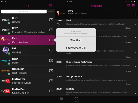 Gledajte televiziju na svojim iOS uređajima (iPhone i iPad) uz detaljan elektronski programski vodič (EPG). Da biste mogli da pratite TV sadržaj, neophodno je da imate internet protok od najmanje 2Mbps.
