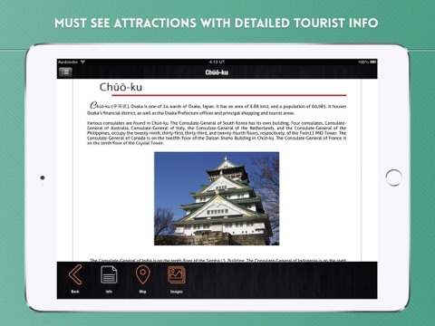 Tourist info for must see attractions such as Chūō-ku, Osaka Castle, Amerikamura, Shinsaibashi, Dōtonbori, Umeda, Umeda Sky Building, World Trade Center, Tsūtenkaku, Sumiyoshi Taisha, Sumiyoshi-zukuri, Shitennō-ji, Tempozan Harbor Village Ferris Wheel, Osaka Aquarium Kaiyukan, Tobita Shinchi, Kita-ku, Nakanoshima Park, Minami-Temma Park, among others.