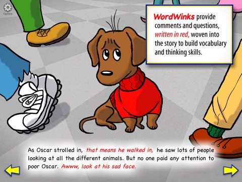 * WordWinks technique weaves onscreen questions and comments, written in red italics, into the story to maximize vocabulary, comprehension and listening skills.