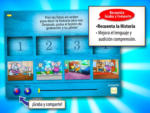 Le da a su hijo un obsequio especial: “recontar” la historia es una importante práctica para desarrollar las habilidades para escuchar y hablar. Ofrece la oportunidad de aprender y utilizar nuevo vocabulario...pone las ideas en orden de modo que tengan sentido...identifica detalles importantes...y fortalece la memoria. Ayude a su niño(a) a grabar su propia versión de la historia y compártanla con la abuelita y otros seres queridos, profesores y amigos… ¡desde la aplicación (app)!