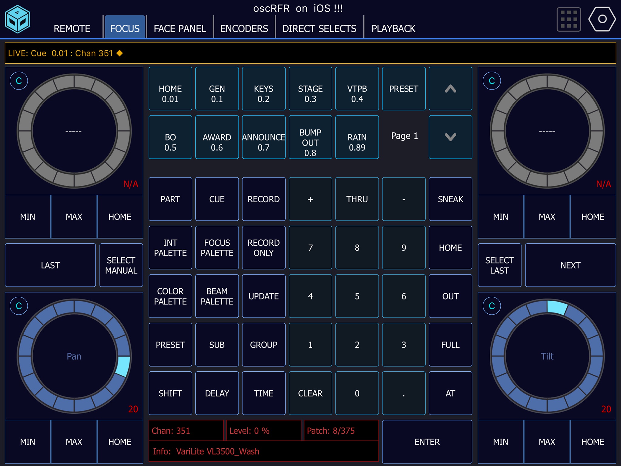 Designed from the ground up to be the ultimate EOS Focus Remote, oscRFR allows the user instant access to virtually every key on the console - Its your EOS in your Hand!