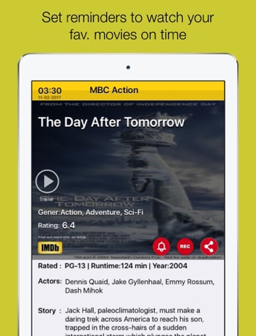 The app is designed to meet your busy day too, we know that you might be so busy to check the movie schedule but we also know that you dont want to miss your favorite movies too. Therefore, the app will send you automatic notification whenever top rated movies are about to be played. You can also set your own reminders before any movie you want.